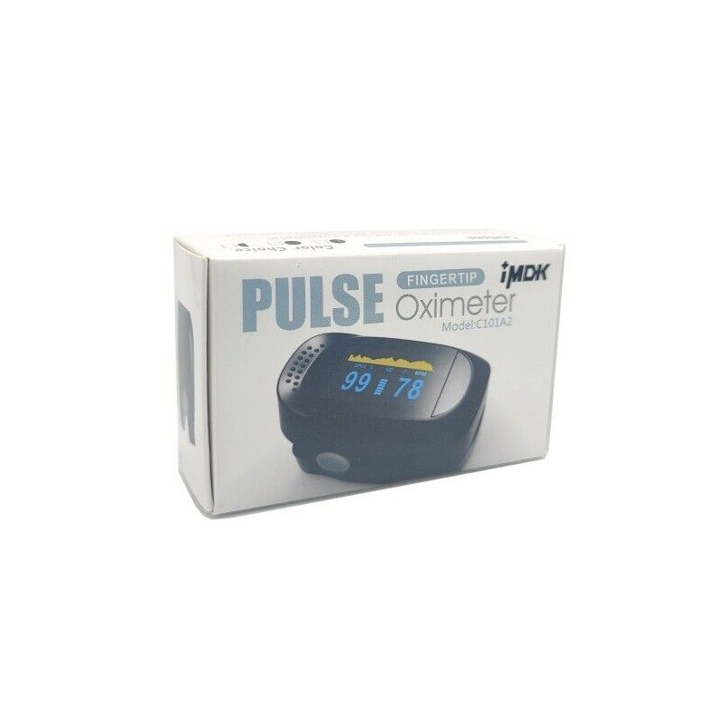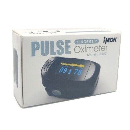 El oxímetro de pulso de dedo IMDK C101A2 cabe en cada dedo y funciona con un botón. Suena una alarma para indicar un nivel de oxígeno bajo o alto y una frecuencia cardíaca rápida o lenta.